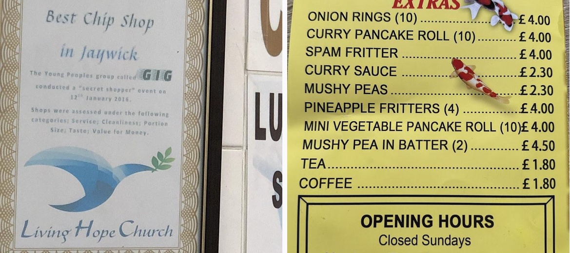The Fry Inn offers an iconic takeaway experience in Jaywick, known for its generous portions of traditional fish and chips. This casual eatery stands out with its golden battered fish and crispy chips, making it a favorite among locals and tourists alike. With a price range of £1 to £10, it’s wallet-friendly and perfect for a quick, satisfying meal. While the atmosphere is laid-back, the flavors are anything but dull. Diners appreciate the fresh, quality ingredients, from succulent cod to crispy chicken nuggets. The Fry Inn is tailor-made for families, offering a children’s menu at great value, ensuring everyone leaves happy and well-fed.